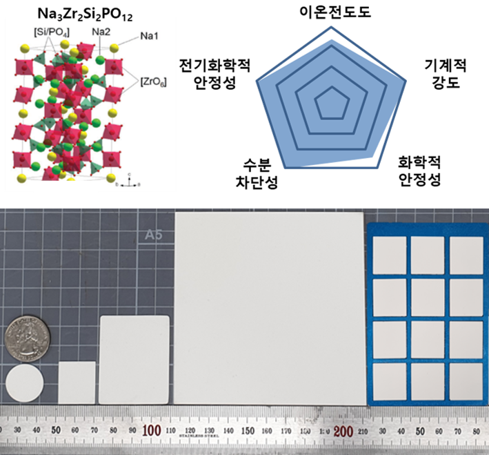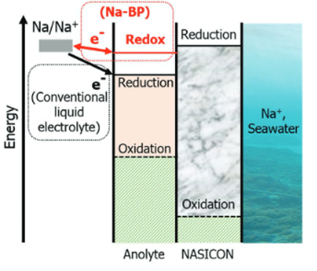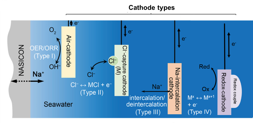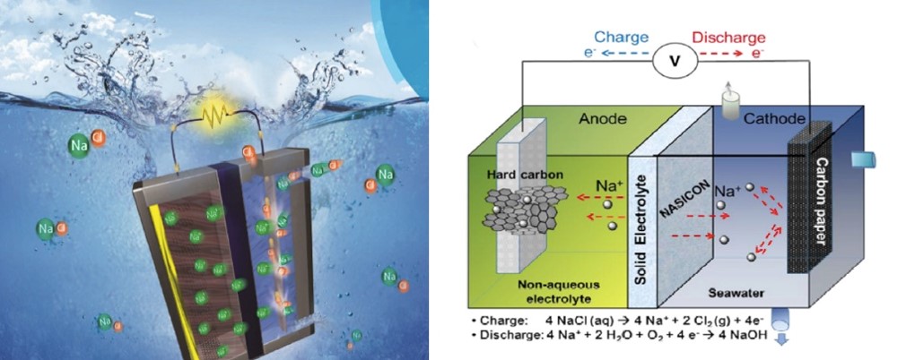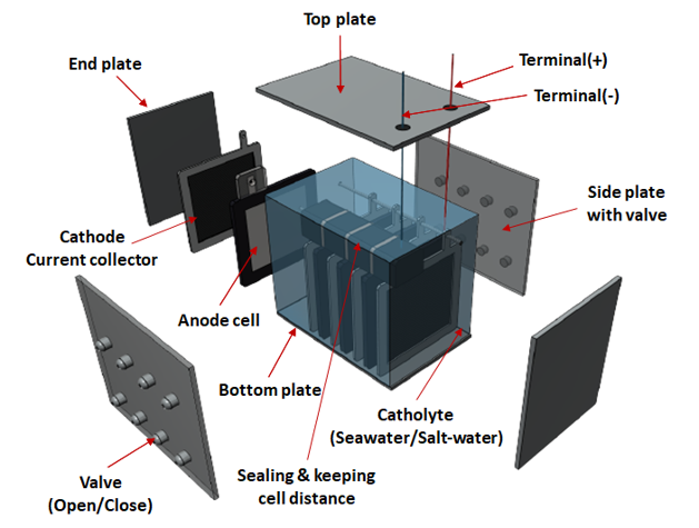 1 Seawater Battery SWB 설명 Seawater Battery (SWB) 해수 이차전지는 해수를 양극 활물질 또는 전해질로 사용하는 전지로, 충∙방전이 가능한 에너지 저장 시스템입니다. 이 시스템은 자연 해수를 활용함으로써 기존 리튬이온전지 대비 낮은 양극 제조 비용 및 풍부한 원자재 그리고 높은 화재 안정성의 장점을 가지고 있습니다. 그리고 해수를 양극으로 사용할 경우 나트륨 이온을 자연 해수로부터 무한하게 공급받을 수 있어 높은 수준의 이론 에너지밀도를 가지는 신개념 차세대 이차전지 기술입니다. SWB 핵심기술 선택적 Na+ 투과 고체 전해질 고체전해질은 해수와 음극 사이에 위치하여 Na+이온을 선택적으로 이동시켜주고, 동시에 비수계 음극을 수계 양극으로부터 보호해주는 분리막 역할을 수행합니다. 현재는 수분차단성 및 화학적 안정성이 높은 산화물 NASICON (Na Super Ionic Conductor) 을 사용하고 있으며, 해수이차전지 타입에 맞추어 다양한 형태의 고체전해질을 제작 및 적용하고 있습니다. 안정적인 Na 저장공간 음극 음극은 해수에서 추출한 Na를 저장하는 곳으로, 해수전지의 에너지량과 수명을 결정하는 파트입니다. 기존 소듐이온배터리와 해수전지는 셀의 구조가 다르기 때문에, 해수전지만의 독자적인 방법으로 에너지 저장 방법이 연구되고 있습니다. 풍부한 Na 공급 양극 천연해수를 양극 활물질로 사용하여, 해수에 녹아있는 소금(NaCl)과 물(H2O)의 전기화학 반응을 통해 에너지를 저장 및 사용할 수 있습니다. 또한 해수 외에도 나트륨이 포함된 용액 (소금물, 수산화 나트륨) 등에서도 작동이 가능하여 풍부한 Na 공급으로 인한 고에너지 밀도를 가집니다. 해수전지 셀 및 모듈 해수전지 소재인 양극, 음극, 고체 전해질 소재들을 결합하여 하나의 해수전지 셀을 개발합니다. 용량, 효율 등 셀의 성능을 판단하는 요소들을 고려하여 최적화된 셀을 디자인합니다. 또한, 다수의 셀을 체결함으로써 실제 에너지 저장장치로 사용가능한 해수전지용 모듈을 연구합니다.