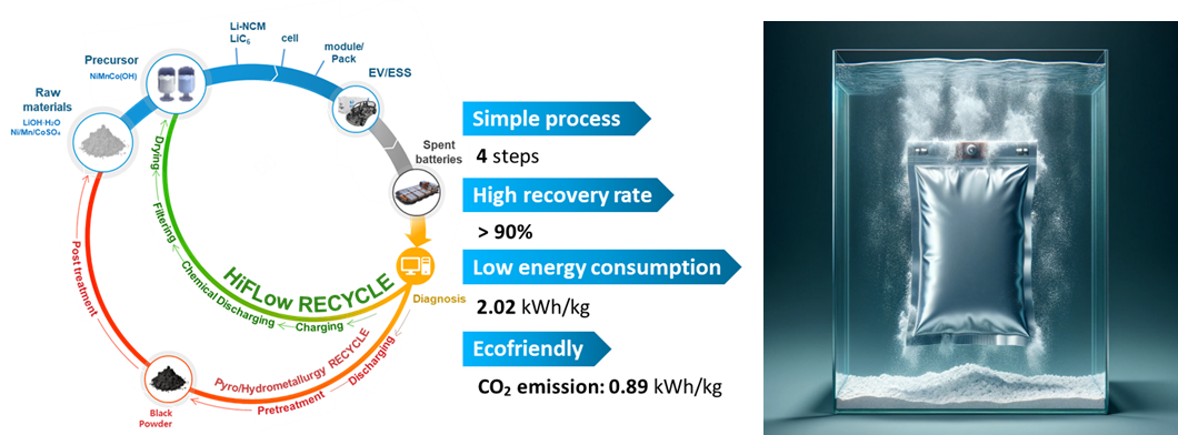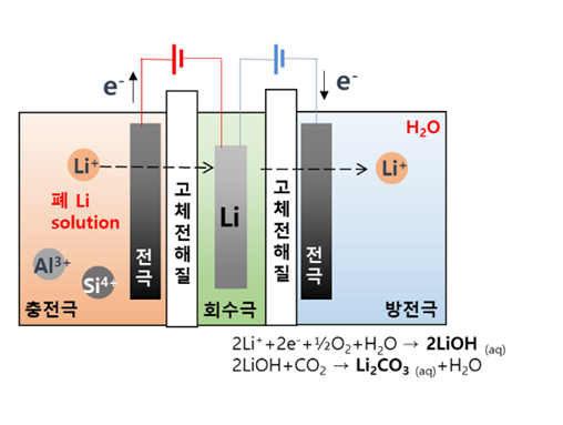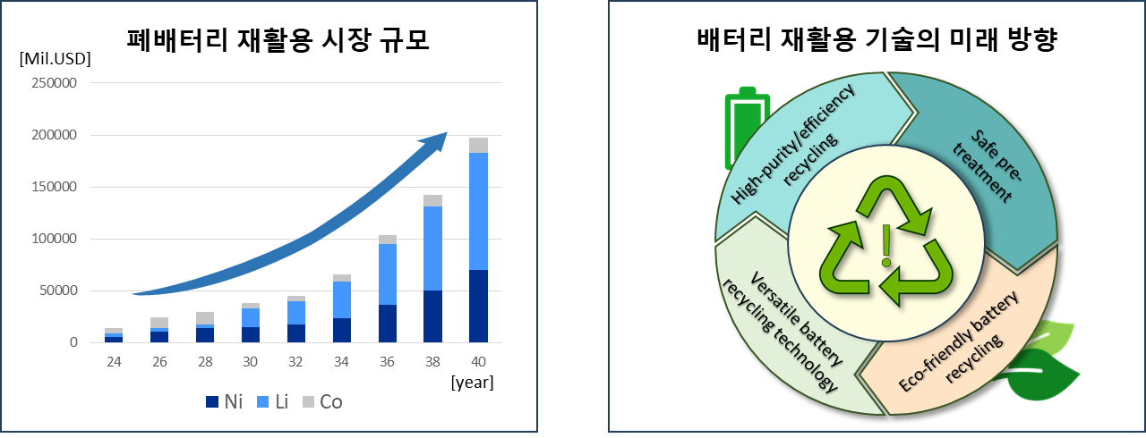 1 Seawater to Resource Technology WTR 설명 Waste To Resource (WTR) 리튬 이온 배터리 시장의 성장과 함께 배터리 재활용 시장도 주목 받고 있습니다. 배터리 생산량의 증가는 폐 배터리의 양을 늘리고, 유가 금속의 고갈과 함께 환경적 문제를 야기할 것입니다. 따라서 배터리 내 주요 금속 (Li, Ni, Co, Mn 등)을 효과적으로 회수할 수 있는 배터리 재활용 기술(WTR)의 중요성이 커지고 있습니다. 현재 사용되는 재활용 기술은 환경 파괴, 화재 및 폭발의 위험, 그리고 높은 처리 비용 등 여러 문제점을 안고 있습니다. 이를 해결하기 위해, 친환경적이고 안전하며 비용 효율적인 새로운 배터리 재활용 기술 연구가 진행 중입니다. WTR 핵심기술 HiFlow (High-efficiency, Fast-process, and Low-cost) HiFlow 기술은 전통적인 열처리와 분쇄 방법 대신, 친환경 용액에 배터리를 침지 및 분해하여 자발적인 화학 방전을 유도하는 방법으로, 리튬을 더욱 효과적으로 추출하는 기술입니다. 이 기술은 기존 방식의 환경 유해성과 낮은 안전성 문제를 해결하고자 개발되었으며, 높은 효율, 신속한 공정, 낮은 비용의 장점을 가지고 있습니다. 현재 HiFlow 기술을 향상 시키기 위해 리튬 추출 용액, 전해질 영향, 양극재 재활용, 다종 배터리 적용 연구가 진행 중에 있습니다. 전기 화학적 리튬 추출 기술 전기 화학적 리튬 추출 기술은 폐 리튬 자원으로부터 전기 화학적 공정을 통하여 활용 가능한 형태의 자원(LiOH, Li2CO3)으로 추출하는 시스템으로서 이를 위한 시스템 디자인, 회수용 전극 개발, 세라믹 고체 전해질 연구를 진행 중입니다.