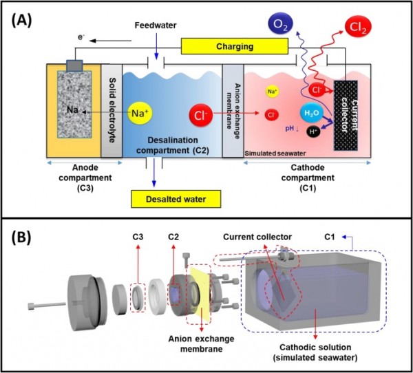 Water-stressed countries have been shifting their sources of clean water from inland freshwater to seawater. This led to a comprehensive exploration of seawater desalination processes to address water scarcity; however, membrane processes have expensive operational costs and high energy consumption. In this regard, this study presented a novel energy self-sufficient desalination system design that incorporates rechargeable seawater batteries as an additional energy storage system. Experimental data were projected using the reverse osmosis system analysis model to determine the configuration that achieved the lowest energy consumption and highest charging rate. The results show that the seawater battery achieved a satisfactory desalination performance with >90% and 74%−82% removal of sodium and chloride ions from actual water samples, respectively. Among the configurations, using ultrafiltration as pretreatment and applying 1.8 mA as initial current yielded the lowest energy consumption (1.35 kWh/m3) and the highest energy charging rate (1.01). Compared to the conventional reverse osmosis desalination plants (2.83 kWh/m3), the seawater battery-desalination system has a huge potential in addressing the major disadvantages of current desalination technologies.