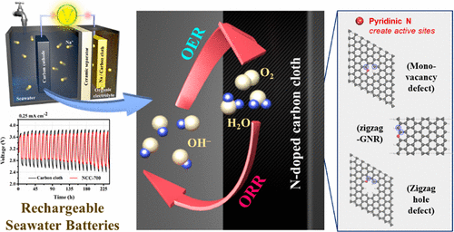 Sodium-metal-based seawater batteries (SWB) are considered an attractive energy storage system because of the cost-effective nature of Na+ ions. However, the high overpotential and low power output caused by the limitations of the cathode material have impeded their commercialization. To overcome these injurious issues, herein we report the enhanced oxygen reduction reaction (ORR)/oxygen evolution reaction (OER) activities of SWBs using a well-controlled N-doped carbon cloth as a cathode current collector. The resulting electrochemical performance reveals that the presence of pyridinic-N prepared by pyrolysis at 700 °C is related to the enhanced electrocatalytic activity toward the OER and ORR and the improved electrochemical behavior of the SWB. At a current density of 0.25 mA cm–2, the SWB with a pyridinic-N-containing cathode shows a lower overpotential of 0.84 V and a higher power density of 9.66 mW cm–2, which are significantly better than those of graphitic-N-dominated carbon cathodes. Furthermore, the in-depth density functional theoretical (DFT) calculations support our claim that pyridinic-N-doping at the zigzag edges or monovacancy defects of the carbon structure are responsible for the enhancement in the electrochemical performance of the SWB, and the carbon atoms close to pyridinic-N are the main active sites.