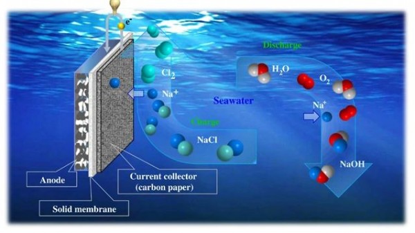 between a battery and a fuel cell, and is accordingly referred to as a hybrid fuel cell. The circulating seawater in this opencathode system results in a continuous supply of sodium ions, which gives this system superior cycling stability that allows the