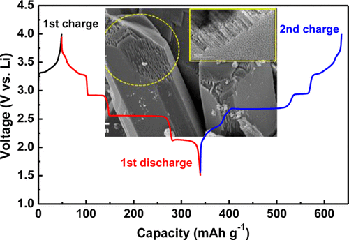 we prepared the LixV2O5 from electrochemical ion exchange of β-Na0.33V2O5, which is obtained by chemical conversion of NaVS2 in air at high temperatures. Crystal structure and particle morphology of β-Na0.33V2O5 are characterized by using X-ray diffraction, scanning electron microscopy, and transmission electron microscopy techniques. Energy-dispersive X-ray spectroscopy and X-ray photoelectron spectroscopy, in combination with electrochemical data, suggest that Na ions are extracted from β-Na0.33V2O5 without irreversible structural collapse and replaced with Li ions during the following intercalation (i.e., charging) process. The thus obtained LixV2O5 delivers a high discharge capacity of 295 mAh g–1, which corresponds to x = 2, with crystal structural stability in the voltage range of 1.5–4.0 V versus. Li, as evidenced by its good cycling performance and high Coulombic efficiency (under 0.1 mA cm–2) at room temperature. Furthermore, the ion-exchanged LixV2O5 from β-Na0.33V2O5 shows stable electrochemical behavior without structural collapse, even at a case of deep discharge to 1.5 V versus Li.