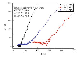 In this study, the influence of the processing parameters, such as the synthesis temperature and the lithium sources on the structure, particle size, morphology and ionic conductivity of Li1+x Ti2−x Al x (PO4)3 (LTAPO) was investigated. LiNO3, LiCl, and Li acetate were employed as lithium sources for investigating the effects of Li sources on the properties of the solid electrolyte. The morphologies and the particle size distribution of the prepared LTAPO samples were analyzed by using scanning electron microscopy (SEM) and a laser particle size analyzer. Their crystallinities were measured by means of X-ray diffraction (XRD). An increase in the synthesis temperature caused a pronounced growth in the particle size without any impurities, especially at temperatures above 700 °C. In addition, LiCl lithium sources showed the highest particles size. The effect of the processing parameters on the ionic conductivity of the prepared LTAPO was investigated by using electrochemical impedance spectroscopy (EIS). The ionic conductivities of the LTAPO prepared by using an optimized synthesis temperature with different lithium sources were 8.36 × 10−4, 5.73 × 10−4, and 7.18 × 10−4 S/cm for C-LTAPO, A-LTAPO, and N-LTAPO, respectively. The properties of the ceramic solid electrolyte were shown to be affected by the choice of the synthesis temperature and the Li source material.