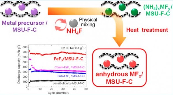 Metal fluorides (MFx) are one of the most attractive cathode candidates for Li-ion batteries (LIBs) due to their high conversion potentials with large capacities. However, only a limited number of synthetic method, generally involving highly toxic or inaccessible reagents, currently exist, which has made it difficult to produce well-designed nanostructures suitable for cathodes; consequently, harnessing their potential cathodic properties has been a challenge. Herein, we report a new bottom-up synthetic method utilizing ammonium fluoride (NH4F) for the preparation of anhydrous MFx(CuF2, FeF3, and CoF2)/mesoporous carbon(MSU-F-C) nanocomposites, whereby a series of metal precursor nanoparticles pre-confined in mesoporous carbon were readily converted to anhydrous MFx through simple heat treatment with NH4F under solventless conditions. We demonstrate the versatility, less-toxicity, and efficiency of this synthetic method, and, using XRD analysis, propose a mechanism for the reaction. All MFx/MSU-F-C prepared in this study exhibited superior electrochemical performances, through conversion reactions, as the cathode for LIBs. Especially, FeF3/MSU-F-C maintained a capacity of 650 mAh g−1,FeF3 across 50 cycles, which is ~90% of its initial capacity. We expect that this facile synthesis method will trigger further research into the development of various nanostructured MFx for use in energy storage and other applications.