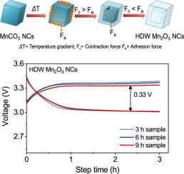 Synthesis of the strongly anisotropic materials, such as highly porous hollow double walled cubes are considered excellent approach to maximize the diffusion of electrolytes. Herein, hollow doubled walled (HDW) Mn2O3 nanocubes (NCs) were synthesized by facile hydrothermal method followed by calcination method. The growth of nanocubes were studied by performing hydrothermal reaction at different times ranging from 3 to 9 h. Thereafter, the feasibility of prepared HDW NCs as air cathode in hybrid Na-air battery was systematically investigated. Among all, the sample prepared by 9 h hydrothermal treatment showed superior performance than 3 and 6 h samples. The fabricated hybrid Na-air cell using HDW Mn2O3 NCs displayed 330 mV overpotential gap and 90% electrical energy efficiency at 5 mA g−1 current density, maximum of 0.2 W g−1 power density and good cyclic stability up to 75 cycles which is attributed to the highly porous nature of material that allows efficient diffusion of electrolyte ions and oxygen from air. Thus, present investigation suggests that HDW Mn2O3 NCs can be a potential air cathode and can be utilized in other metal-air battery systems.