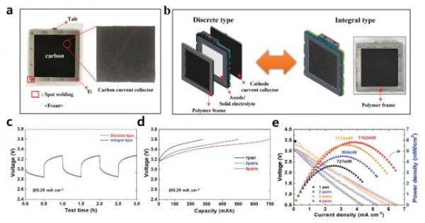 Rechargeable seawater batteries (SWBs) using seawater as a catholyte have attracted extensive attention owing to the ocean's high theoretical energy density (3051 Wh L-1, 3145 Wh kg-1) and excellent thermal management. However, despite many improvements in materials and cell designs used in SWBs so far, there is a limit on the energy density in practical use, because of the lack of optimization of the cell structure. Herein, this work introduces a novel design by applying a rigid frame with an extended space called “prismatic-type.” Consequently, an energy density of 23 Wh (242 Wh L-1) is obtained by increasing the specific area of the unit cell and the capability of the anode active materials in the internal space. In addition, it enables the design of a discrete type that can improve the power density by increasing the surface area of the cathode current collectors. With the increased surface area, a peak power of 1162 mW is achieved for the discrete type compared to 727 mW for the integral type. These results suggest that these newly designed prismatic SWBs could contribute to practical applications in the near future.