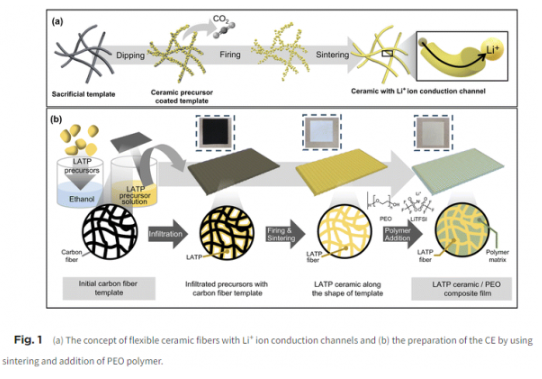 To improve the safety concerns of lithium-ion batteries, a flexible scalable composite electrolyte film (FSCEF) was fabricated based on a fiber-shaped ceramic and polymer support. Ceramic fibers of Li1.3Ti1.7Al0.3(PO4)3 (LATP) were prepared by sintering the precursor-coated sacrificial template and then infiltrated with a polyethylene oxide (PEO) polymer to obtain the FSCEF. The LATP fibers induced continuous Li+ ion channels, allowing the FSCEF to show an ionic conductivity exceeding 10−4 S cm−1 at 60 °C. The synergistic action of the ceramic frameworks and supportive PEO resulted in enhanced mechanical flexibility. Furthermore, the possibility of using a FSCEF in all-solid-state batteries was confirmed by conducting electrochemical performance tests on a Li/FSCEF/LCO (LiCoO2) cell. We expect that the herein reported findings will contribute to the synthesis of thin and flexible solid-state electrolyte films with manufacturing scalability for promising high-voltage all-solid-state batteries.