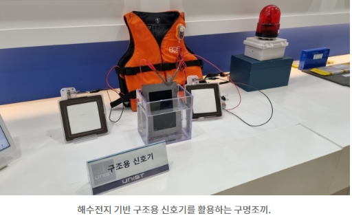 최근 <디지털데일리>가 UNIST 교내 해수자원화기술 연구센터에 방문했을 때에도 해수전지를 활용해 개발 중인 다양한 발명품들을 볼 수 있었는데요. 일례로 바다 위에서 항로표지용으로 쓰이는 ‘등부표’는 대개 납축전지가 쓰이는데, 가격이 싸지만 바닷물 위에서 쉽게 녹이 스는 단점이 있어 자주 교체해야 하고, 비용이 소모되는 단점이 있습니다. 여기에 바닷물을 쓰는 해수전지를 적용해 문제를 해결한 사례가 있습니다. 구명조끼에 부착하는 구조용 신호기에도 해수전지가 단연 유용하게 쓰일 수 있고요.